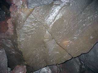さらに2000年の調査では積雪の好条件に恵まれて探索が容易になり、大室山体の北面方向から石塚噴火口に向かって林道から約200m付近で後述の鹿ノ頭溶岩流と石塚溶岩流の接点を確認した。 二つの溶岩流は東の石塚溶岩流と大室山を迂回仕手流れ込んだ鹿ノ頭溶岩流が小さなV字状を形成しながら接触している(図2参照、立原による:本HPでは省略)。石塚溶岩流は下流に大杉樹型群、本栖樹型群等を形成しており今後の溶岩流調査の鍵となろう。